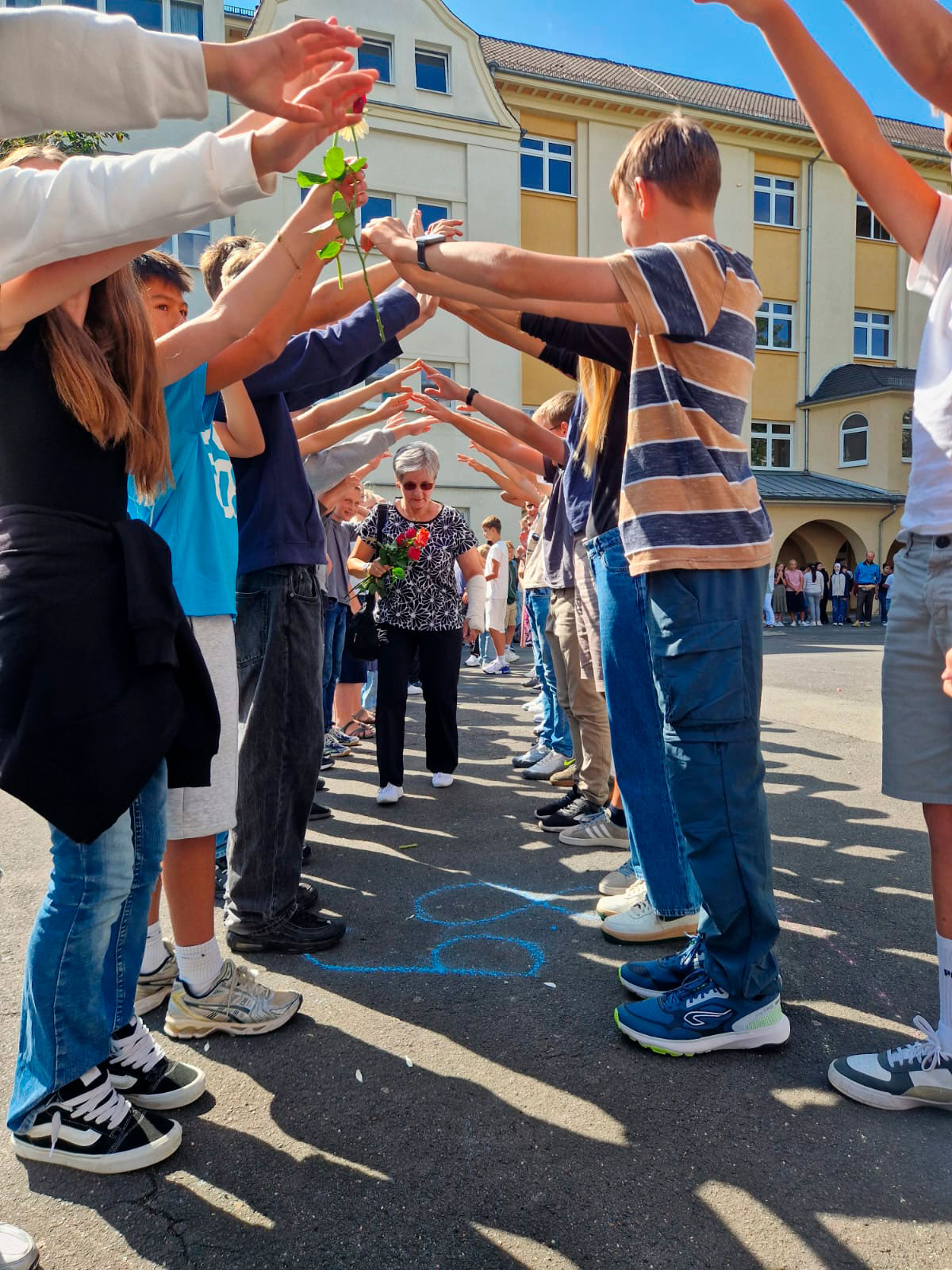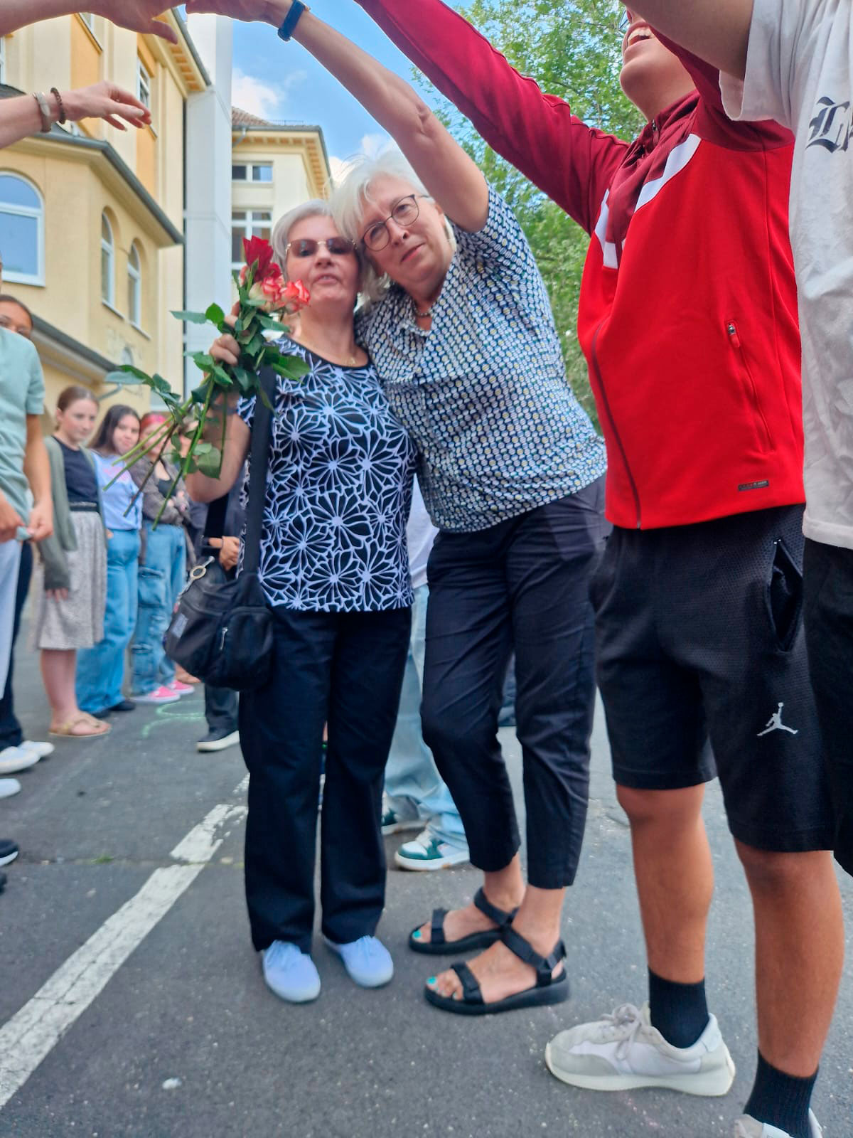 Alle Schülerinnen und Schüler bildeten im Schulhof ein Spalier und verabschiedeten sie auf ihrem Weg hindurch, häufig mit Händedruck, Umarmungen und kleinen Geschenken. Sogar ehemalige Schüler waren extra gekommen, um sich persönlich zu verabschieden und „Danke“ zu sagen. Denn Frau Wirth war für alle auch eine Vertraute, manchmal fast „Mamaersatz“, ihr konnte man alles erzählen, sie spendete Trost und aufbauende Worte.